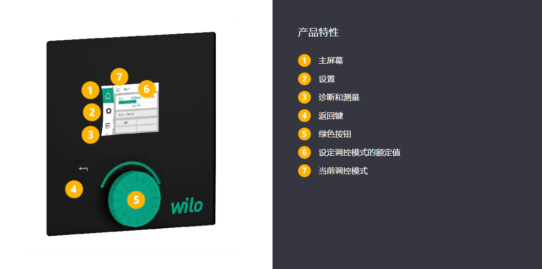 - Wilo绿色按钮技术和带返回功能的软按钮,用于菜单导航和水泵设置