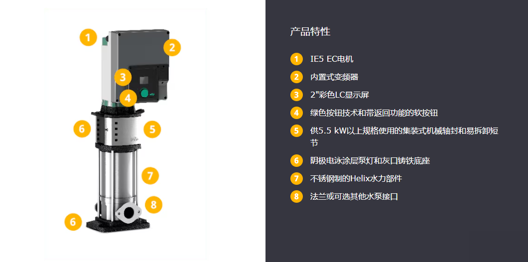 立式设计的高效不带自吸的高压多级离心泵,采用直联式连接,配有符合 IEC 60034-30-2 标准的 IE5 能效等级的数控 EC 电机。