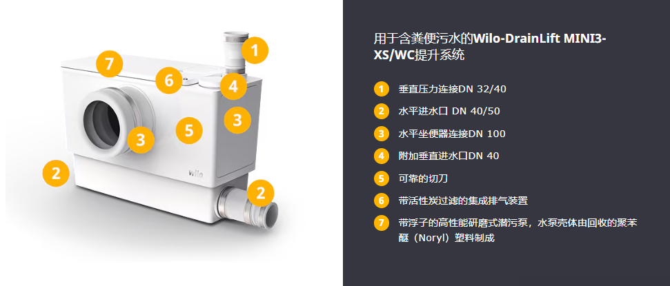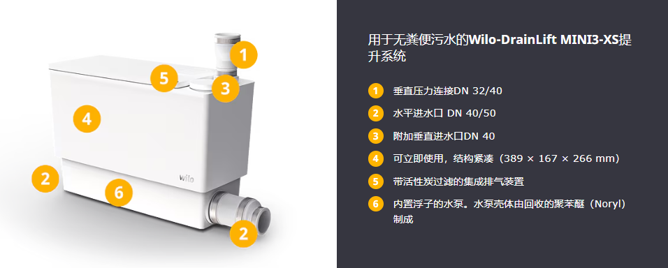 节省空间、可立即使用的提升系统,用于单个房间的污水排放,可以排放来自座便器、淋浴、洗碗机、洗衣机和地下室厨房的污水。
